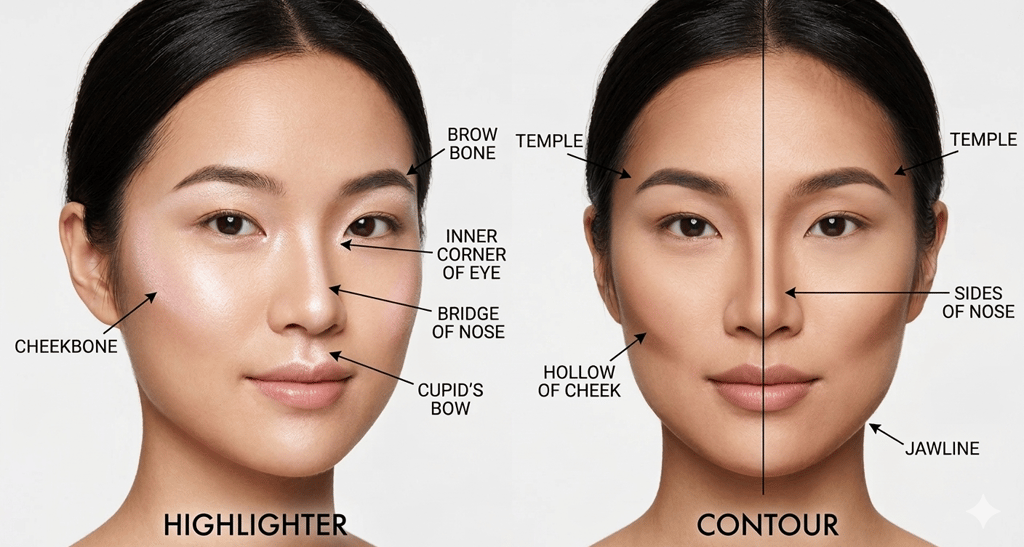 4. Contouring To add dimension to Asian features, I use a budget-friendly contour stick. Apply a C-shape between the bridge of the nose and the eye socket (avoid drawing two straight vertical lines down the entire bridge). Create a V-shape at the tip of the nose to slim and refine it, then apply a few strokes along the jawline at the base of both cheeks, blend thoroughly with a brush to make a natural look.